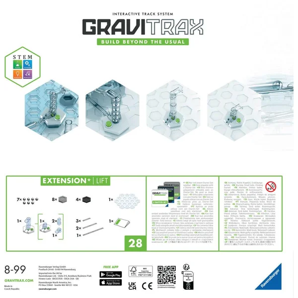 Agrandis et booste tes circuits de billes GraviTrax avec cet ascenceur à billes et ces blocs supplémentaires ! Ce set d’extension se joue avec au moins un Starter Set et peut ensuite se combiner à tous les produits GraviTrax. Contenu : 1 ascenseur, 7 billes, 1 plateforme transparente, 8 blocs de construction épais, 4 blocs de construction fins, 1 rail long, 2 rails moyens, 3 rails courts, 1 guide d’utilisation.