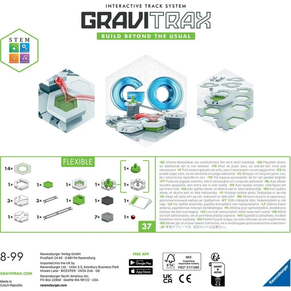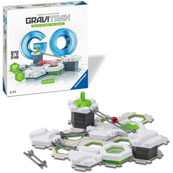 GraviTrax GO Flexible contient tout ce dont vous avez besoin pour vous familiariser avec GraviTrax ! Les virages, les rails, les blocs de construction et plus encore sont les éléments de base, nécessaires pour créer vos circuits avec l’élément phare : le Trampoline. Jusqu’où et à quelle hauteur la bille saute-t-elle du trampoline ? Peut se combiner avec tous les produits de la gamme GraviTrax. GraviTrax GO Flexible dispose de 37 pièces dont un livret avec des plans de montage selon les niveaux de difficulté facile, moyen et difficile. Il s’agit d’une introduction ludique et créative à l’univers GraviTrax.