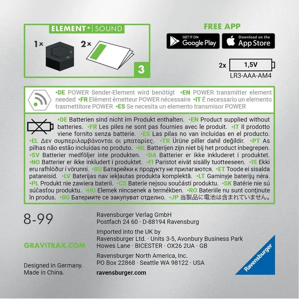 Ajoutez du son à votre circuit de billes pour le rendre encore plus amusant ! Construis des circuits à billes GraviTrax POWER électroniques et connectés !Il existe 3 facons d’utiliser le son. Lorsque la bille passe dans un élément connecté, un signal est envoyé et un son se déclenche selon la couleur sélectionnée. Il est également possible de sélectionner une musique d’ambiance parmi 6 univers, jungle ou espace par exemple, ou encore de mettre un mode aléatoire. Le volume peut se régler. Cet élément POWER se combine avec tous les produits GraviTrax (packagings blancs, noirs et gris).
