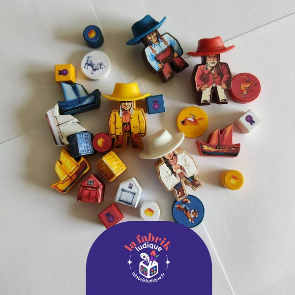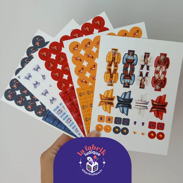 - Stickers recto/verso pour les pions personnages, bâteaux, disques, entrepôts, Or et Certificats