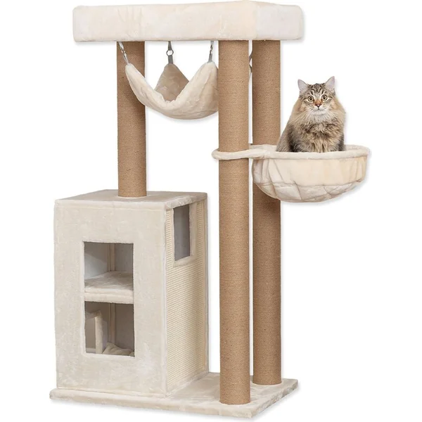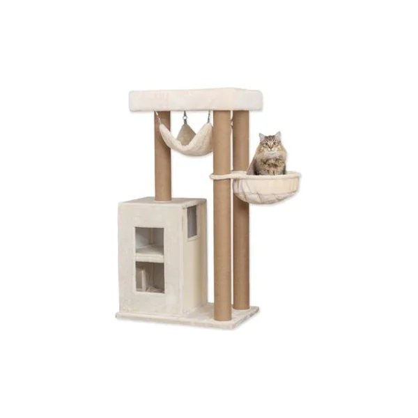 - Avec sa construction à deux niveaux, le chat a une vue d’ensemble et la possibilité de se déplacer et de sauter.