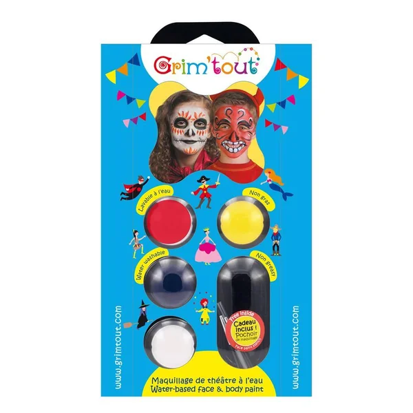 GRIM’TOUT est un maquillage non gras à l’eau de qualité spécialement conçu pour convenir aux peaux délicates des enfants. Toujours dilué à l’eau, il s’applique simplement à l’aide d’une éponge ou d’un pinceau ! Démaquillage aisé à l’eau et au savon. Qualité professionnelle et conformité aux normes cosmétiques. Les sets 4 couleurs thématiques sont très appréciées pour les supports d’animation de groupe et soirées à thème. Le set CATRINA contient : 4 couleurs, un pinceau de qualité, une éponge de maquillage et un mini mode d’emploi illustré. Contenance : 4 x 4 ml.