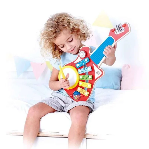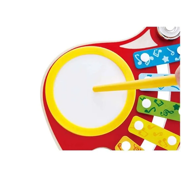 La guitare orchestre comprend cymbales, tambour, xylophone et guiro. Un orchestre à lui tout seul. FAQ