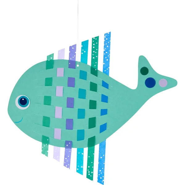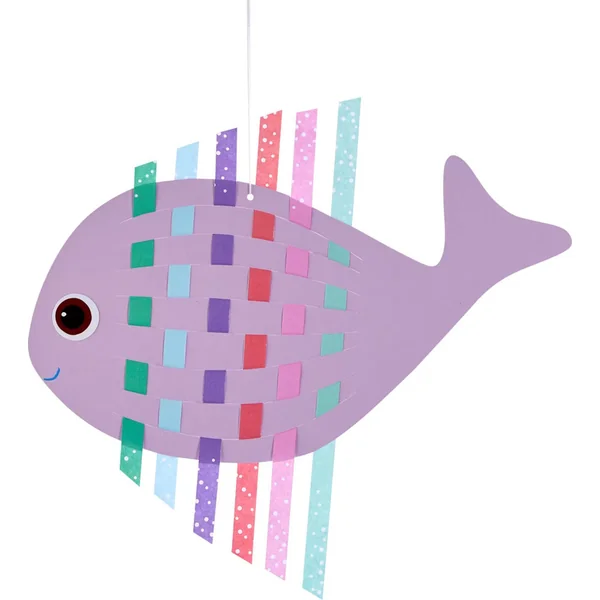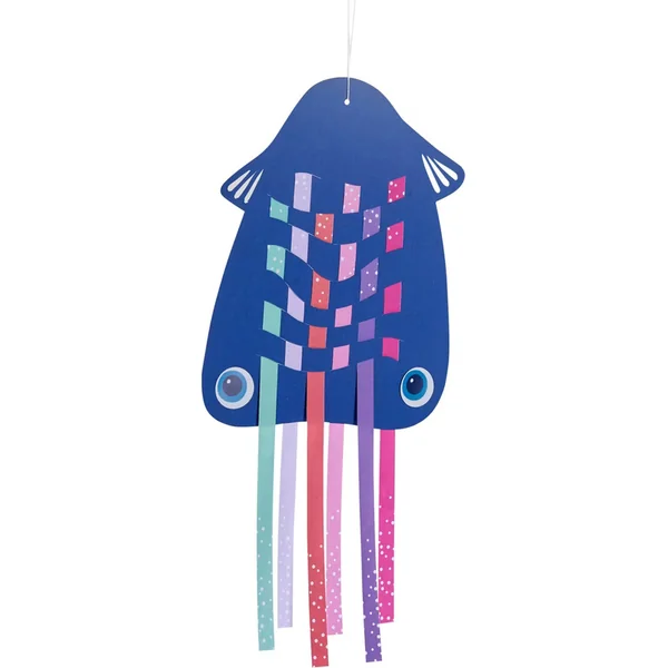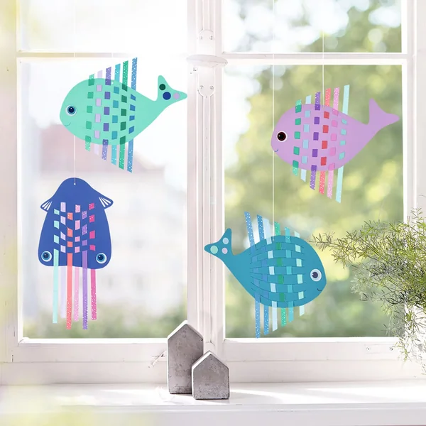 Le kit contient 4 animaux marins prédécoupés, à travers les ouvertures desquels des bandes de papier colorées sont enfilées à l’aide de aiguilles à tricoter.