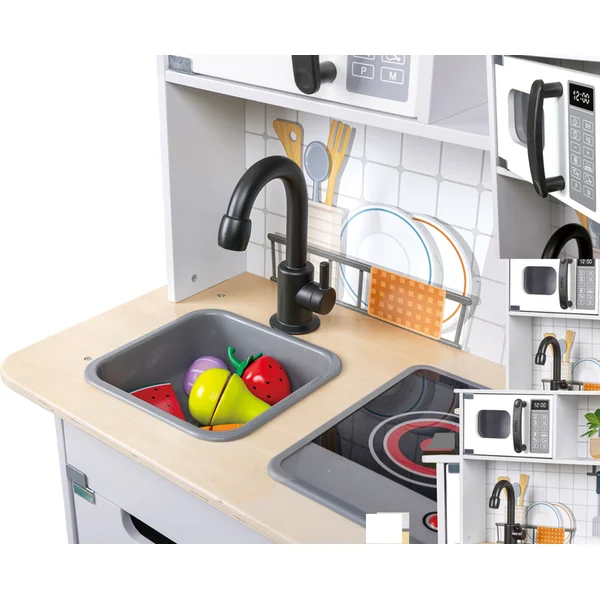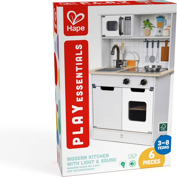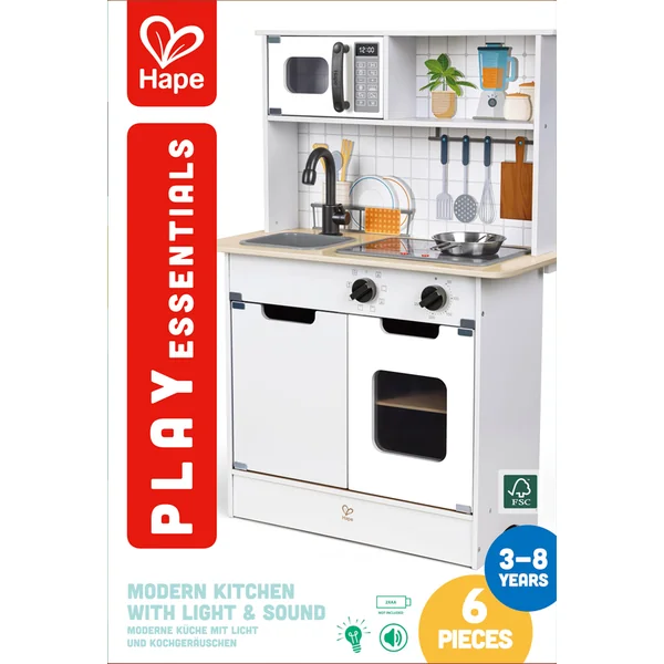 Hape Cuisine moderne avec lumière et son. Entrez dans le monde de la cuisine contemporaine avec la cuisine moderne Hape, conçue pour une expérience immersive. La cuisine offre des effets lumineux et sonores réalistes qui imitent fidèlement l’atmosphère d’une cuisine animée et rendent le jeu encore plus amusant.