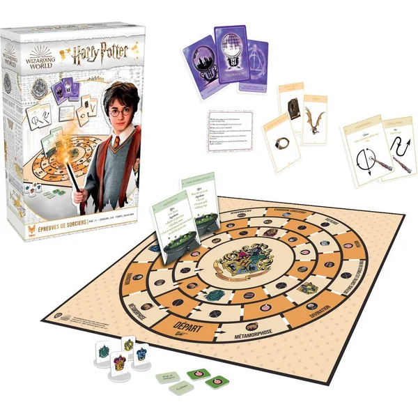 Les révisions à l’école Poudlard sont terminées, place aux 7 épreuves individuelles ou collectives qui sélectionneront les meilleurs Sorciers et Sorcières de l’année. Les résultats de chaque épreuve sont essentiels et vous permettront d’obtenir des points supplémentaires pour tenter de remporter la Coupe des Quatre Maisons avec votre Maison favorite Gryffondor, Poufsouffle, Serdaigle ou Serpentard. Pour chacune de ces épreuves, démontrez vos capacités exceptionnelles de sorcier et améliorez vos compétences à chaque partie pour réussir les 7 épreuves de Métamorphose, de Sortilège, d’Arithmancie, de préparation de Potion, de Divination, d’Histoire de la Magie et de Défense Contre les Forces du Mal où vous allez combattre d’autres élèves de Poudlard ! Serez-vous à la hauteur cette année avec votre Maison pour gagner la coupe face aux autres joueurs, prêt à tout pour vous en empêcher ? De 2 à 8 joueurs. Durée de la partie 20 minutes.
