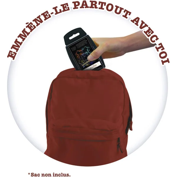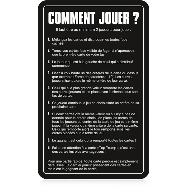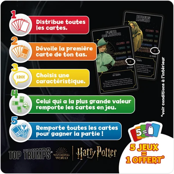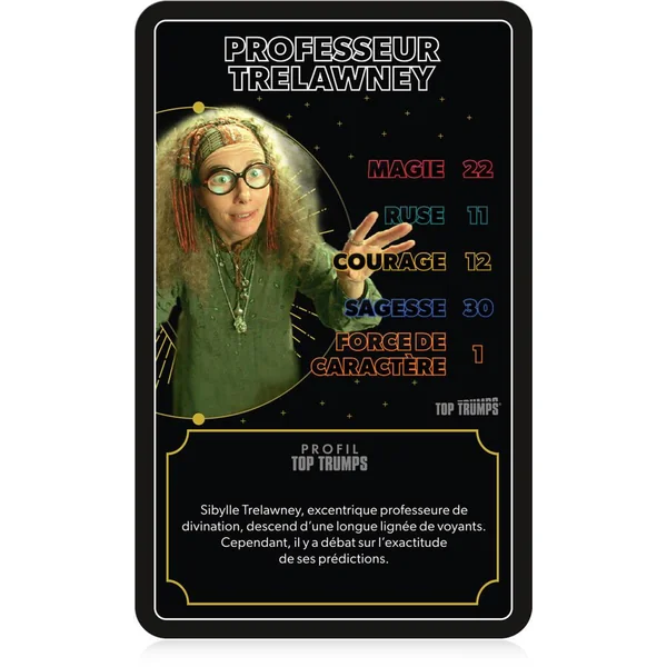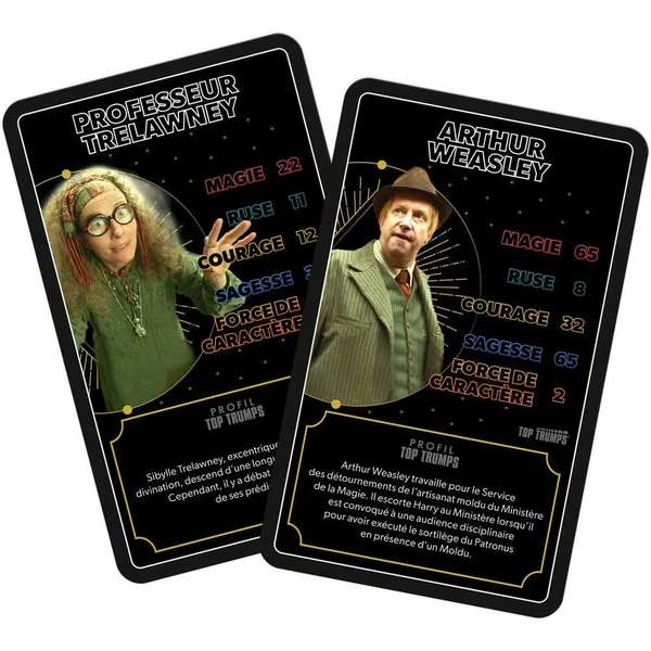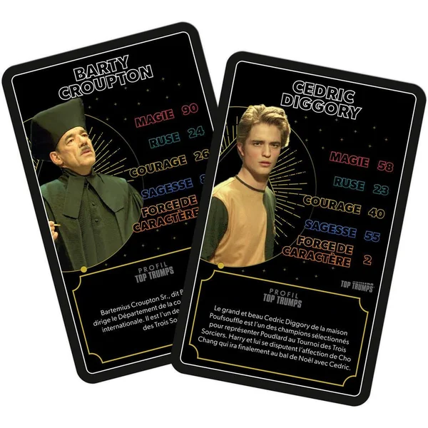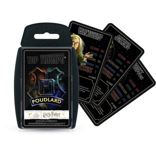 Joue avec tes personnages préférés de l’univers Harry Potter, de Dumbledore à Drago Malefoy, en passant par Hermione, distribue toutes les cartes, choisis une caractéristique parmi la Magie, la Ruse, le Courage, la Sagesse ou la Force de Caractère, et compare-là à celle de ton adversaire. Le joueur avec la valeur la plus forte remporte la bataille. Remporte toutes les cartes pour gagner la partie !