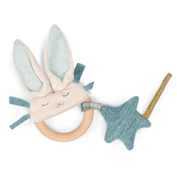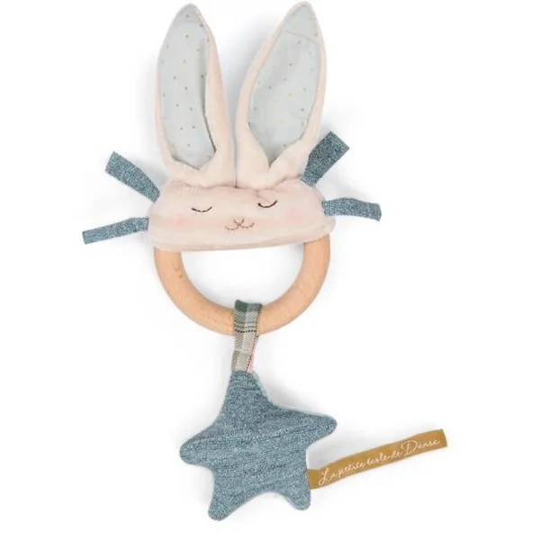 Hochet bois lapin, accompagné de son étoile qui émet un joli son de grelot. Anneau en bois naturel, longues oreilles au bruit de papier froissé, nouettes en forme de moustaches… de quoi éveiller la curiosité de bébé! Facile àsaisir par les petites mains.