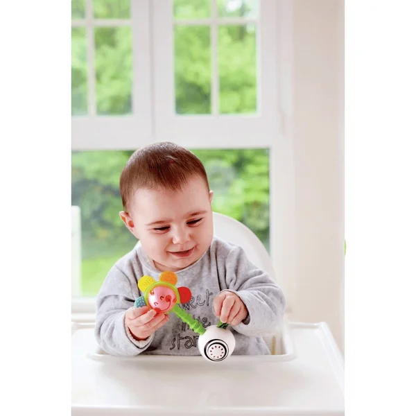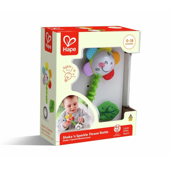 - LUMIÈRES MULTICOLORES : La tête en forme de fleur du hochet s’illumine de couleurs vibrantes à chaque secousse et à chaque tapotement.