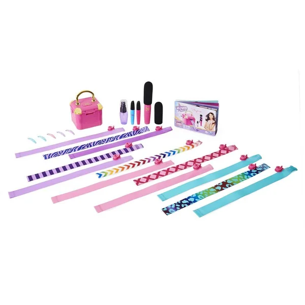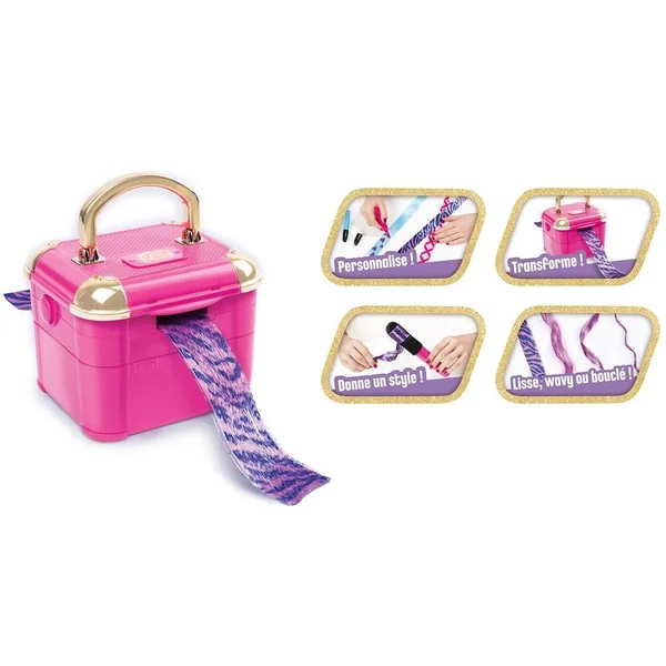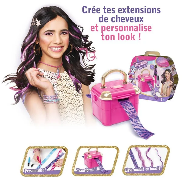 Avec Hollywood Hair, personnalise ton style en créant tes propres extensions de cheveux. La seule machine qui permet de réaliser ses propres extensions. Choisis le motif et colorie les rubans pour les transformer en extensions. Donne-leur ensuite le style que tu souhaites : lisse, wavy ou bouclé. Crée des extensions tendances et variées pour un style unique ! Contient 12 extensions personnalisables, 5 barrettes, 2 feutres, 1 vaporisateur et 1 boucleur.