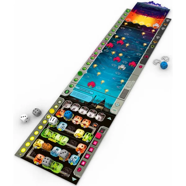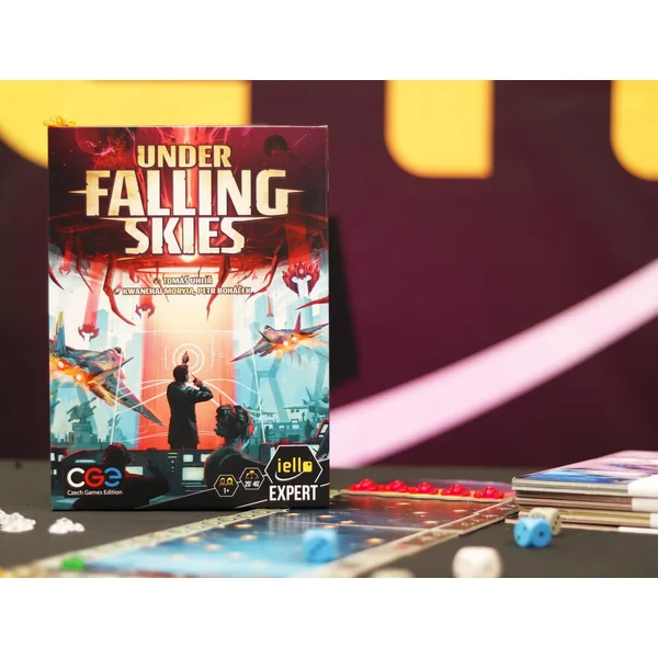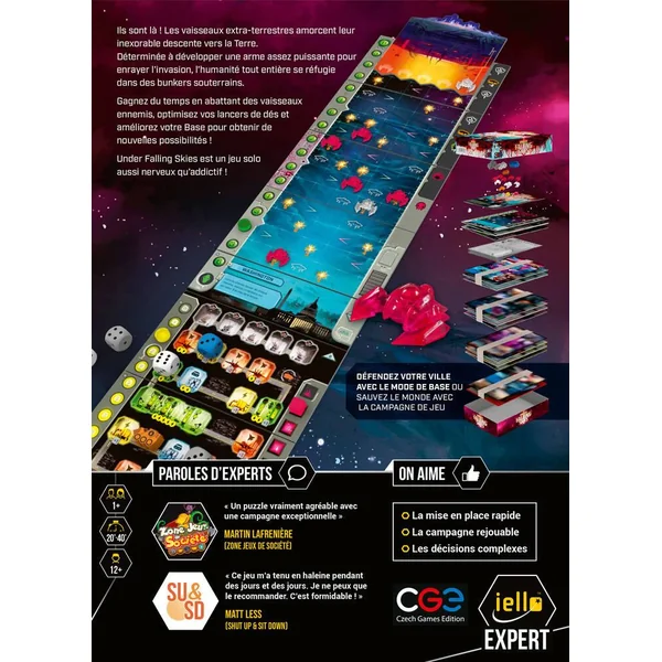 Under Falling Skies est un jeu solo qui invite le joueur à incarner la défense terrienne contre l’attaque extraterrestre. À chaque tour de jeu, le vaisseau ennemi va s’approcher de la planète et la partie sera perdue s’il parvient à se poser.