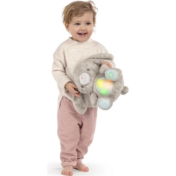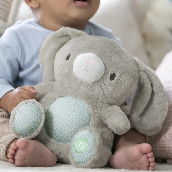 Il aide à garder le bébé calme et heureux, grâce à plus de 15 minutes de sons de battements de cœur, de berceuses sur le thème de la nature, de vibrations et de lumières pulsantes. Votre petit peut activer les lumières et les sons en secouant le jouet ou en appuyant sur la patte de Sylvi, ce qui aide à favoriser le développement de la motricité globale. Ce petit lapin en peluche est idéal pour l’emporter partout avec vous.