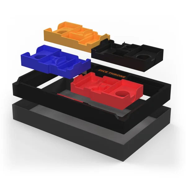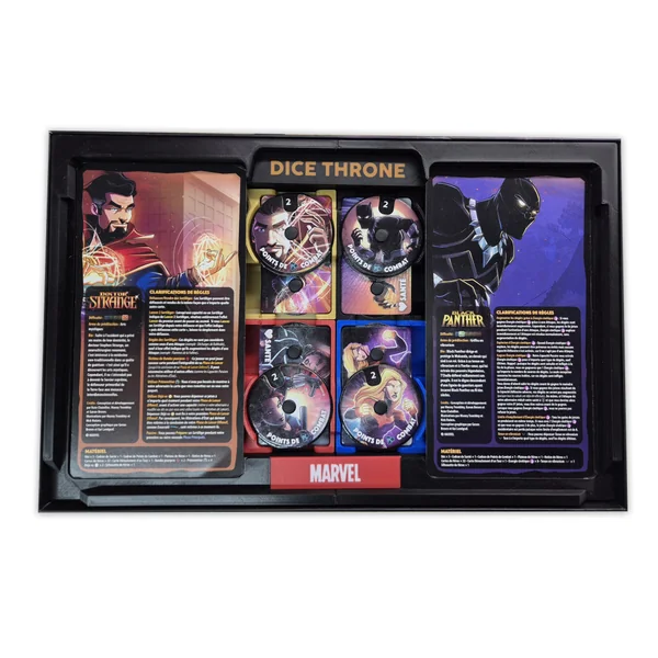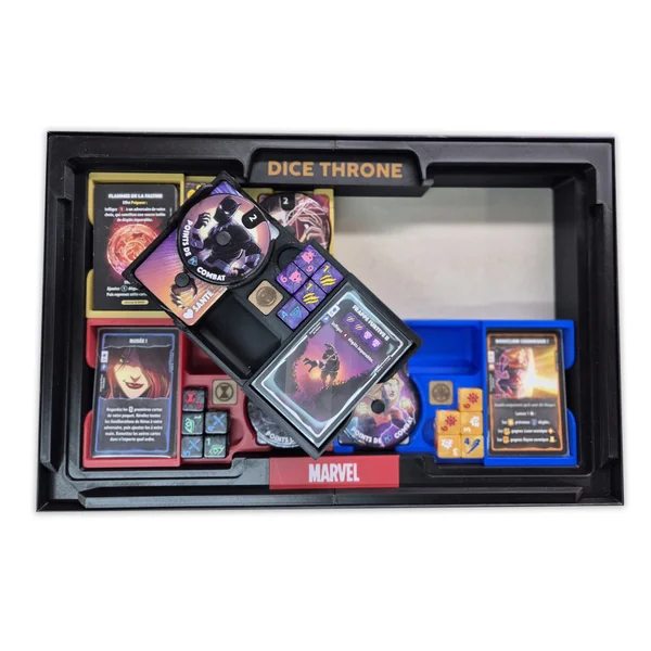 - Un cadre optimisé : Le nouveau cadre emboîtable offre un rangement plus compact et ergonomique, tout en apportant une touche thématique grâce aux plaques décoratives Dice Throne et Marvel.