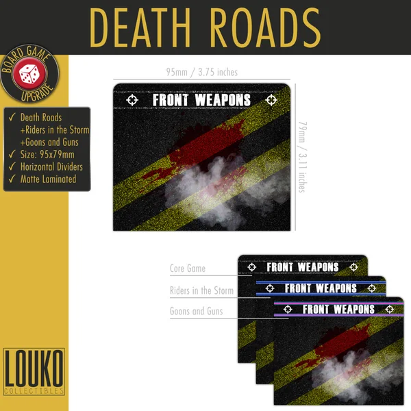 Organisez vos cartes et extensions Death Roads en toute simplicité ! Ayez vos armes, vos voitures et toutes les autres cartes prêtes et minimisez le temps d’installation pour profiter davantage du jeu. Avec 30 cartes intercalaires, vous pouvez organiser Riders in the Storm, Goons et Guns en même temps que le jeu de base. Vous pouvez ainsi configurer le jeu rapidement et comme vous le souhaitez, à chaque fois !