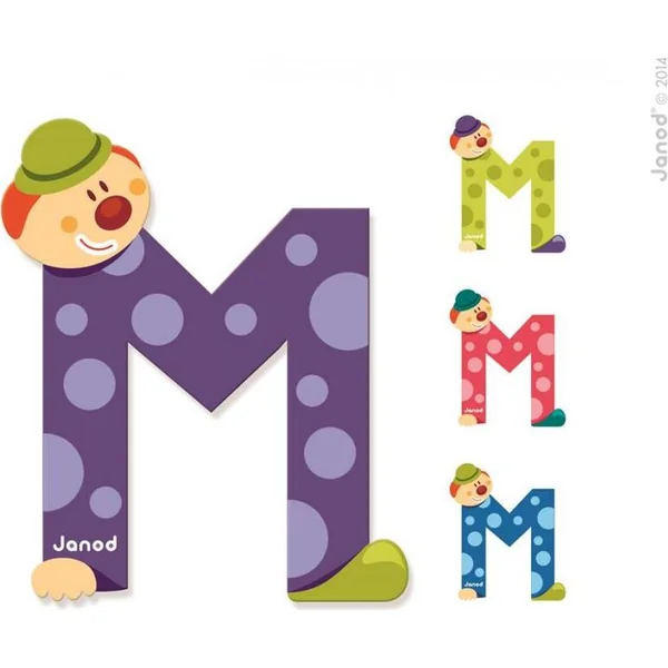 Lettre en bois M Janod avec autocollant, belle décoration pour une porte ou un mur. Choisissez la lettre M Clown parmi 4 couleurs : bleu, vert, violet, rose et indiquez votre choix dans la commande. Le prix indiqué est pour 1 pièce.