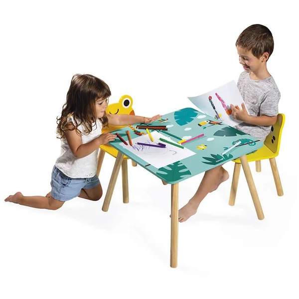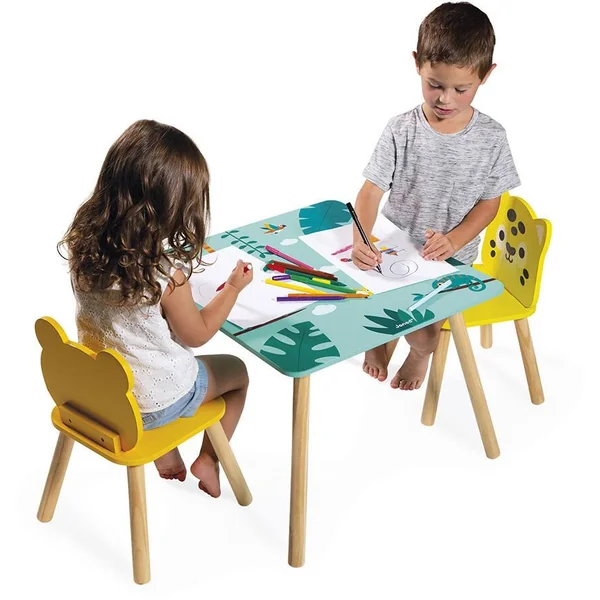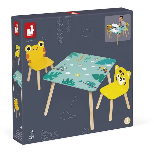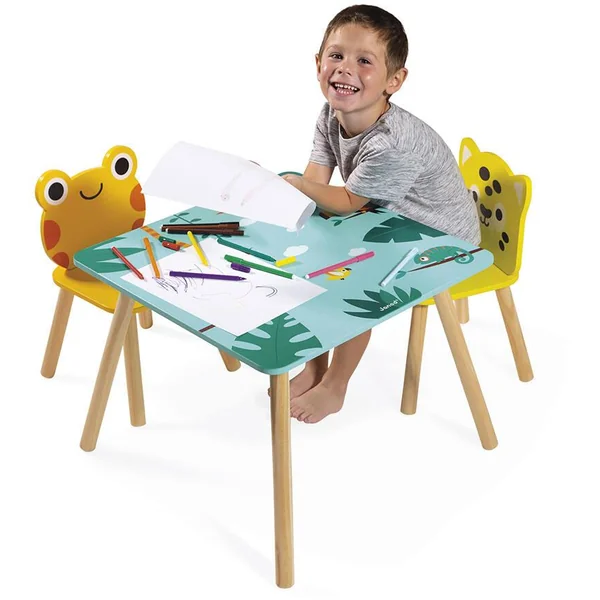 Un instant de détente au coeur de la forêt tropicale ! Ce mobilier composé d’une table aux couleurs peps et de 2 chaises représentant une grenouille et un jaguar, s’intègrera parfaitement à votre séjour ou à la chambre de votre enfant. Cet ensemble accompagnera votre enfant lors de moments calmes pour une lecture ou pour passer quelques heures à jouer et à dessiner. Peinture à l’eau. Ce mobilier est adapté à la taille des enfants à partir de 3 ans. Chaises : 28.6 x 28.5 x 47 cm Table : 55 x 55 x 44.2 cm Hauteur chaises : 21 cm Hauteur table : 44.2 cm Pour créer cette gamme nous avons pris la direction des tropiques à la recherche d’évasion, d’exotisme et de contraste. Pour illustrer au mieux cette nature sauvage, nous avons réuni des animaux joyeux aux couleurs vitaminées et des éléments végétaux aux teintes apaisantes.