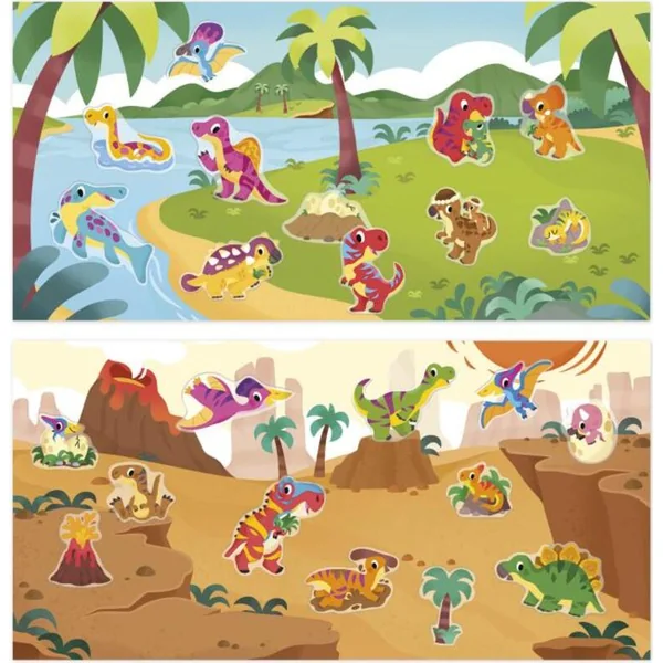 La particularité de cet ensemble créatif est que les autocollants épais avec des dinosaures sont spécialement conçus pour les petites mains : ils sont faciles à manipuler et se décollent facilement. Leur aspect repositionnable signifie que vous pouvez prolonger l’activité, mais aussi imaginer des histoires sans craindre de vous tromper et de coller l’autocollant de façon permanente sur la surface. En parlant de décor, il y a 2 côtés sur le tapis réversible inclus dans l’ensemble : une zone volcanique sèche d’un côté et un environnement plus tropical près de l’eau de l’autre côté. Cette activité manuelle est idéale pour les enfants d’âge préscolaire.