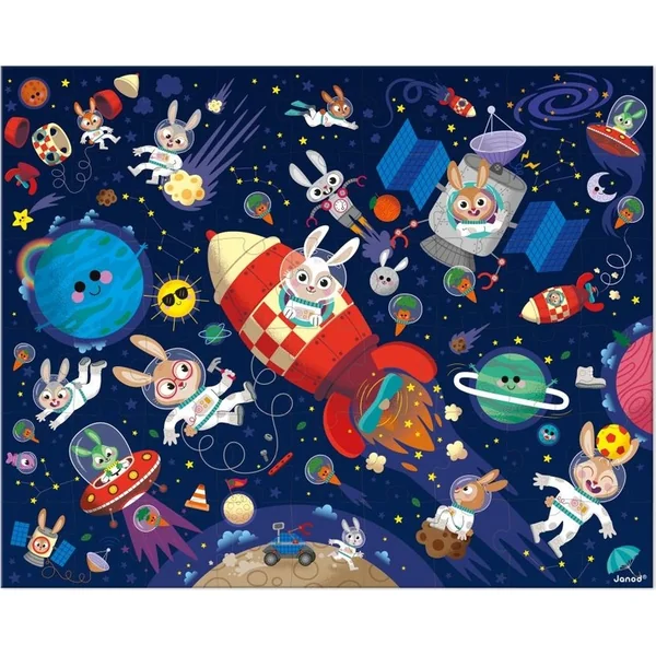 Ce puzzle en carton de 54 pièces est une aventure amusante pendant les courses spatiales avec les lapins. Il est livré avec une affiche qui peut être utilisée comme modèle. Les pièces sont idéales pour les petites mains et aident à développer la motricité fine.
