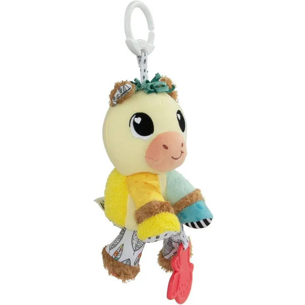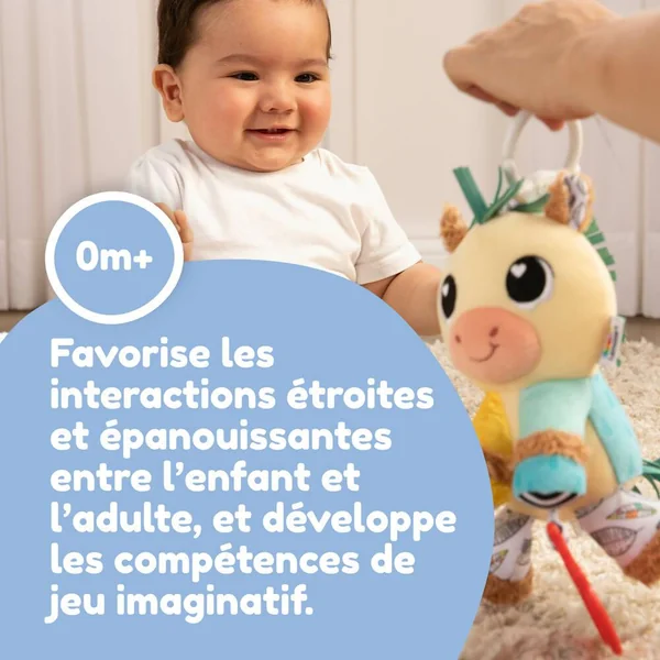 Carson le Cheval de trait de Lamaze est le cheval idéal pour divertir bébé en voyage ! Le corps tout doux de cet adorable petit cheval présente une variété de textures et de motifs contrastés qui stimulent l’esprit de découverte de l’enfant. La pomme qui y est attachée est parfaite pour être mâchouillée et permet à l’enfant de découvrir le monde qui l’entoure avec sa bouche comme avec ses mains. Carson est également un compagnon de voyage idéal, car il est équipé d’une attache multifonctionnelle qui permet de l’accrocher facilement à la poussette ou au sac à langer. Il restera ainsi aux côtés de votre enfant, où que vous alliez. Ajouter du contenu à propos de son de carillon et des bruissements dans la description principale. Création de liens : Favorise les interactions étroites et épanouissantes entre l’enfant et l’adulte, et développe les jeux d’imagination.