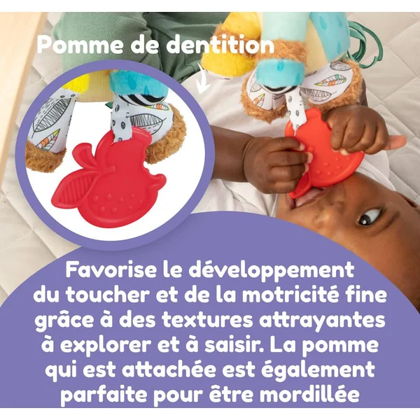 Jouet d’éveil : Favorise le développement du toucher et de la motricité fine grâce à des textures attrayantes à explorer et à saisir. La pomme qui est attachée est parfaite pour être mâchouillée