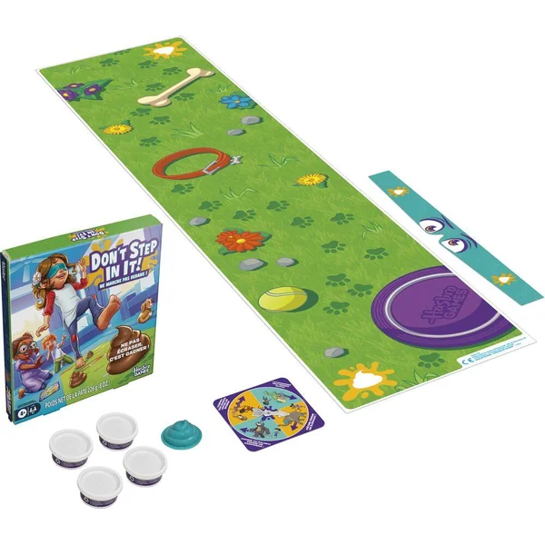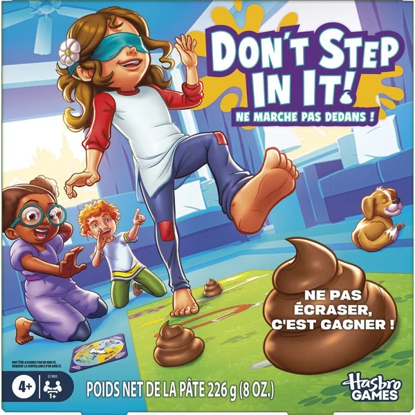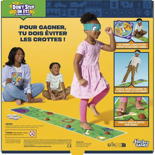 Ne pas écraser, c’est gagner ! Dans le jeu Don’t Step in It!, les enfants tentent d’éviter les crottes en se déplaçant le long du tapis en imitant un animal, le tout les yeux bandés ! Un joueur fait tourner la roulette de mouvements d’animal pour obtenir l’un des 8 mouvements d’animal, comme sauter comme une grenouille ou piétiner comme un éléphant. Puis, il se bande les yeux et traverse le tapis en imitant cet animal. Mais attention ! Des petits tas de pâte, moulés pour ressembler à des crottes, ont été placés stratégiquement sur le tapis. Qui évitera le plus de crottes pour gagner ? Que l’on soit à la recherche de jeux de groupe amusants pour enfants (à partir de 4 ans) ou de jeux amusants pour la famille, ce jeu d’intérieur pour enfants et adultes est hilarant ! Les jeux préscolaires actifs et les jeux de plateaux pour enfants sont de super cadeaux pour les fêtes de fin d’année et les anniversaires des filles et des garçons à partir de 4 ans. Don’t Step in It!, HASBRO et les marques de commerce et logos associés sont des marques de commerce appartenant à Hasbro, Inc.