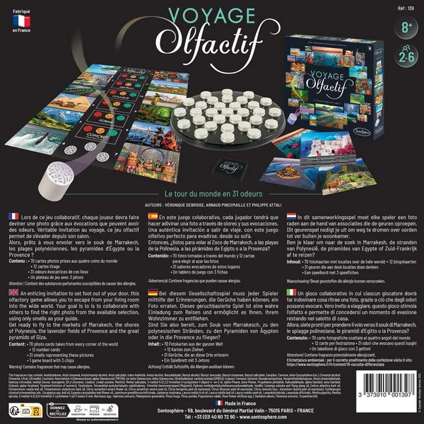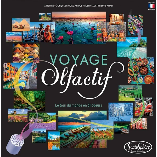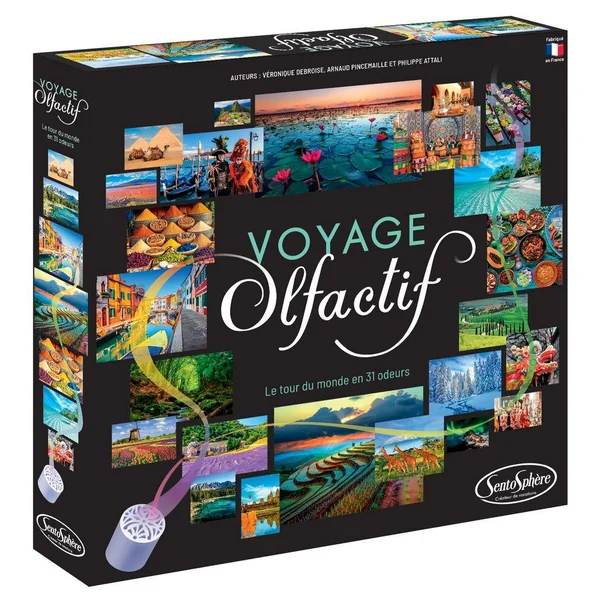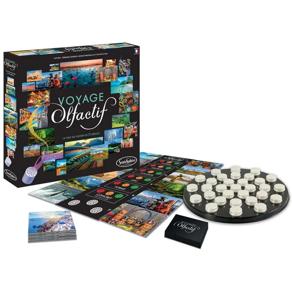 Direction le souk de Marrakech, les plages polynésiennes ou même les pyramides d’Egypte ! Lors de ce jeu collaboratif, chaque joueur, à tour de rôle, doit faire deviner aux autres une photo en la rattachant à des odeurs qui peuvent évoquer son lieu, sa couleur ou même ce qu’elle représente. Les associations peuvent être faciles, comme l’odeur de lavande pour un paysage en Provence. Mais, parfois, il faut redoubler d’astuces et d’imagination pour faire deviner sa photo, car l’odeur du cuir, des algues ou de la citronnelle ne sera pas rattachée à la même expérience. Attachez vos ceintures et envolez – vous avec vos amis pour un tour du monde olfactif ! Odeurs contenues : Poire, Banane, Fruits exotiques, Mûre, Fraise, Orange, Noisettes, Sous-bois, Menthe, Bois, Champignon, Citronnelle, Herbe, Chocolat chaud, Cannelle, Thé, Lait, Curry, Baguette, Jacinthe Bleue, Rose, Monoï, Lavande, Parfum d’orient, Animaux, Cuir, Poisson, Mer, Feu de bois, Encens, Pierres. Un coffret créé et fabriqué à 100% en France.