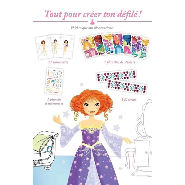 Voici plus de 200 autocollants pour habiller tes princesses !Pour chaque page, colorie le décor, puis choisis une tenue et de jolis accessoires… Et organise ton plus beau bal masqué !