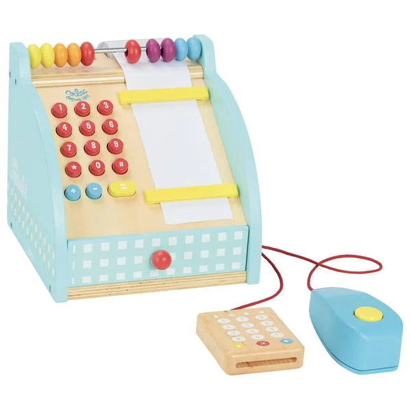 Une caisse enregistreuse en bois avec un tiroir caisse et une douchette sonore, des pièces et billets et une carte de crédit pour jouer à la marchande des heures et des heures.