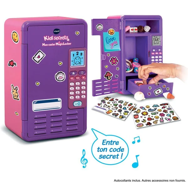 À l’intérieur, le Kidisecrets rose comporte 2 compartiments et 2 tiroirs pour cacher des bijoux et des petits mots. Un écran LCD et un clavier à 10 chiffres se trouvent sur l’avant. Ce dispositif sert à entrer le code secret et est doté de multiples fonctions dont un réglage du volume sonore. Il sert également de commande pour lancer les jeux et activités, les 10 chansons et mélodies intégrés dans sa mémoire interne.