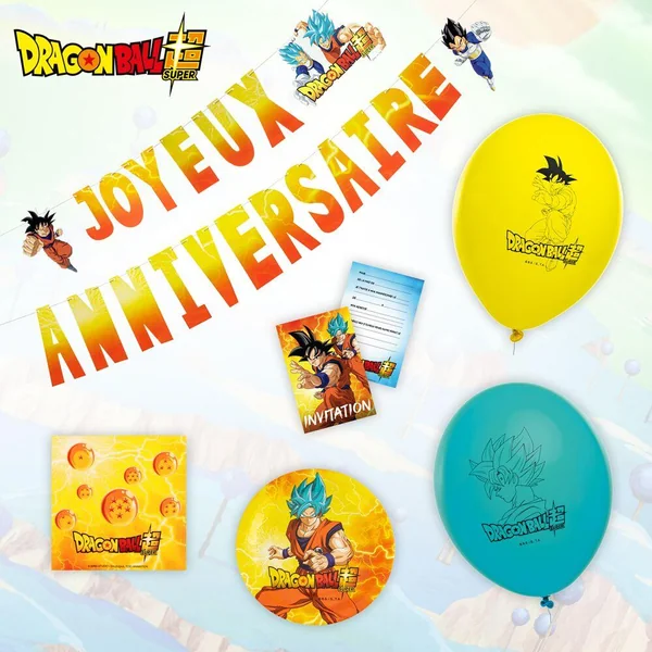 Kit anniversaire dragon ball super, plonge dans l’univers legendaire de dragon ball spuer avec ce kit d’anniversaire colore et plein d’energie, pour les fans de goku et de ses amis