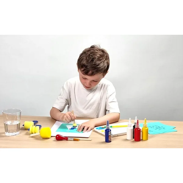 - Tampons et pochoirs : Pour divers effets créatifs, les enfants peuvent combiner pochoirs, tampons et feutres sur le papier, les feuilles de papier plus épaisses supportant également l’utilisation de peintures sans risque de fuite.