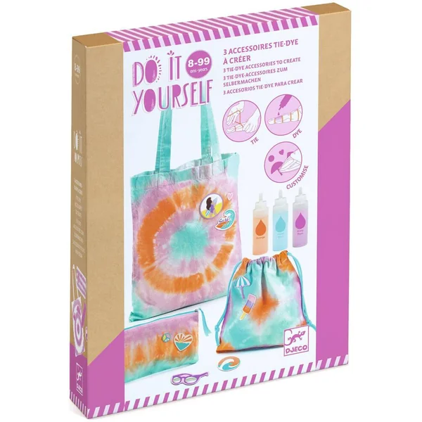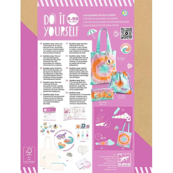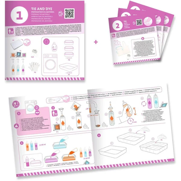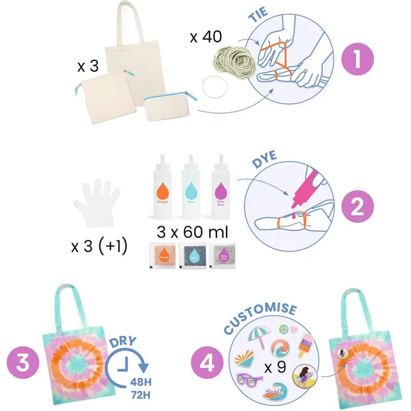 Un kit créatif pour découvrir la teinture tie-dye, ses dégradés uniques, et réaliser différents motifs comme un designer textile. Pour cela, l’enfant va se laisser guider et apprendre à nouer ( tie ) les accessoires en tissu et à les teindre ( dye ) à l’aide des colorants fournis, selon 3 différentes techniques de création de motifs : motifs circulaires ( œil de bœuf ), géométriques et en lignes. Une fois secs, les accessoires peuvent être personnalisés grâce aux écussons thermocollants fournis. Chaque création est unique !