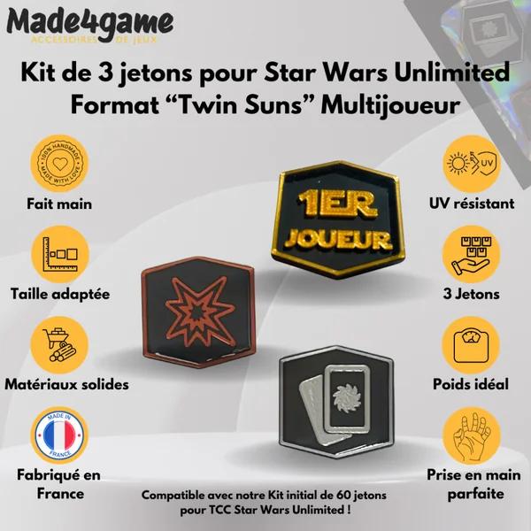 Ce kit de 3 jetons permet de jouer aux mode multijoueur du jeu dans le Format « Twin Suns » proposé dans les règles officiels.