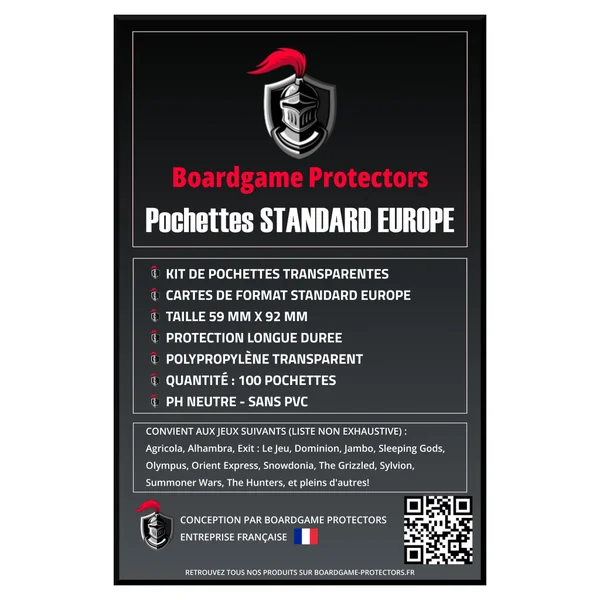 Entreprise française, nous utilisons exclusivement les sleeves de haute qualité Boardgame Protectors conçues spécialement pour vous!