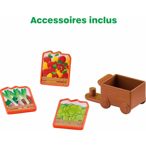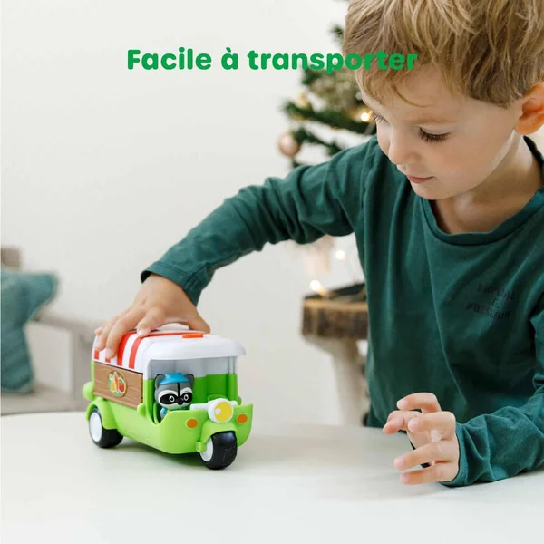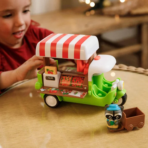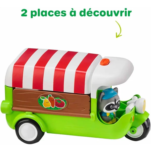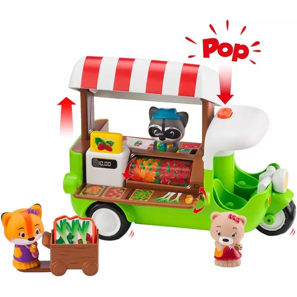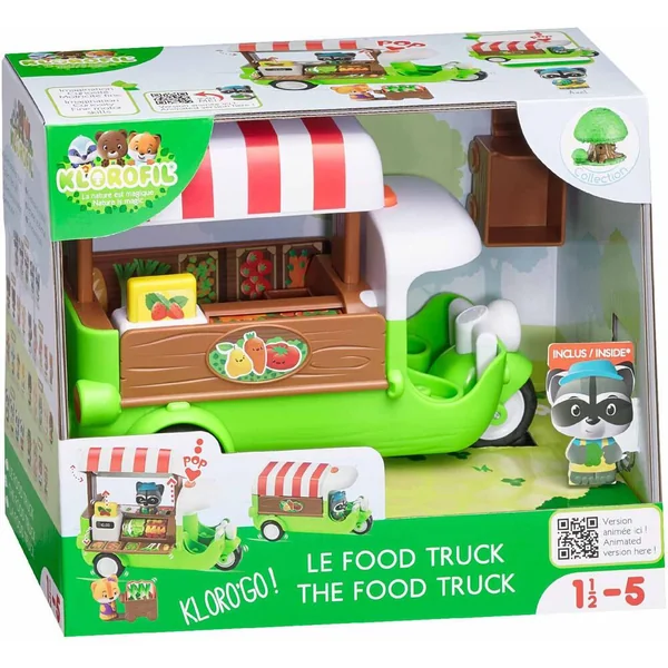 Tut tut ! Ne ratez pas le passage du food truck des Klorofil ! « POP » le toit s’ouvre et le véhicule se déploie des 2 côtés pour laisser apparaitre les fruits et légumes à acheter. Le rouleau permet de faire varier l’étalage. Une pression sur le bouton, et « POP » la caisse enregistreuse fait apparaitre le montant des courses. Avec un chariot pour ranger les 3 cagettes de légumes. Comprend 1 personnage.