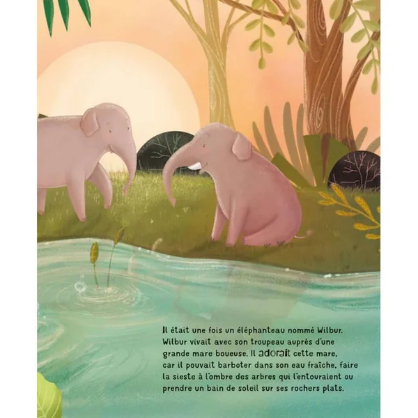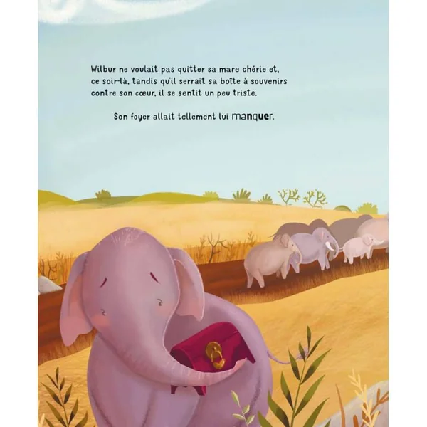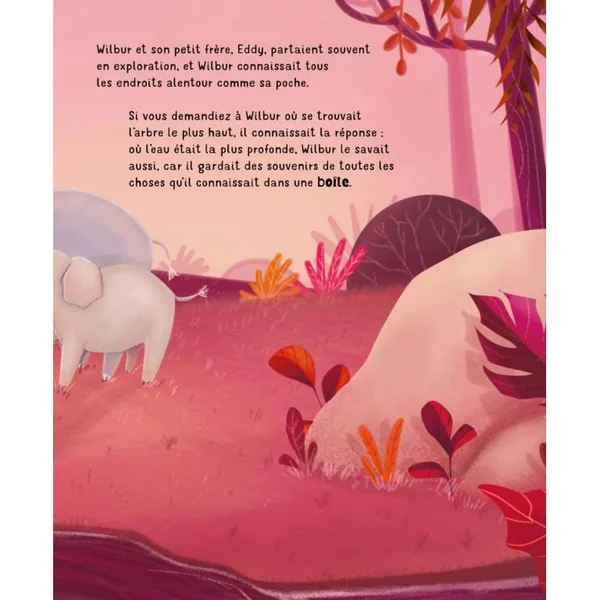 Wilbur était un petit éléphant qui vivait avec son troupeau à côté d’une grande mare d’eau boueuse. Il aimait explorer et connaissait tout de sa maison : il savait quel était l’arbre le plus haut, où l’eau était la plus profonde et quel était le plus gros rocher. Son secret ? Une boîte de souvenirs, qu’il portait toujours avec lui. Un récit doux qui célèbre l’importance et le caractère unique des souvenirs gardés dans le cœur.