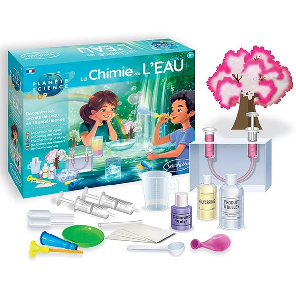 Ce mini laboratoire scientifique propose 16 expériences passionnantes pour s’amuser à comprendre la chimie et la physique de l’élément le plus essentielle à la vie : l’eau.