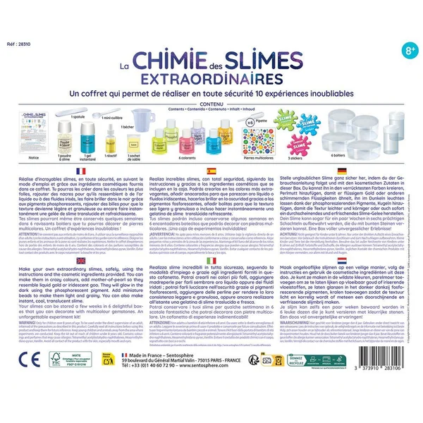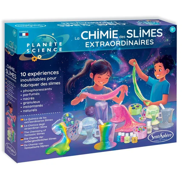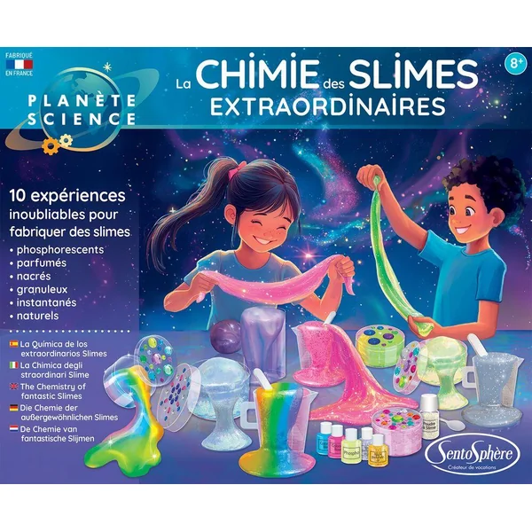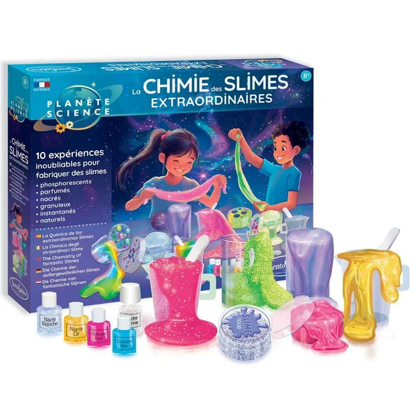 Des Slimes nacrés, dorés, argentés, granuleux, parfumés, phosphorescents… Les apprentis chimistes vont être captivés par les nombreuses expériences de ce coffret !
