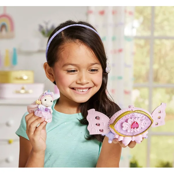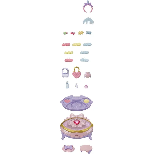 Ce coffret contient Joy, la fille Poney aux cheveux roses et différents accessoires de coiffure. La coiffeuse s’ouvre pour révéler un miroir et une étagère pour disposer ses accessoires. Les accessoires peuvent être rangés dans la coiffeuse et être emportés partout avec vous.