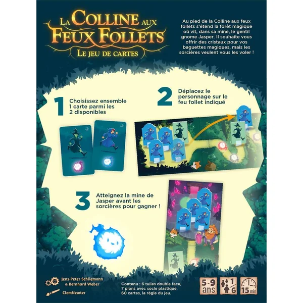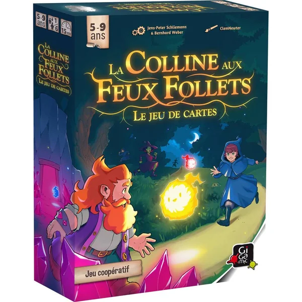 Dans La Colline aux feux follets, le jeu de cartes, incarnez des Apprentis et suivez les feux follets pour rejoindre Jasper le Gnome qui souhaite vous offrir des cristaux magiques de sa mine. Mais les Sorcières veulent les récupérer avant vous ! Choisissez donc tous ensemble les meilleures cartes à jouer pour arriver avant elles et déjouer leur plan.