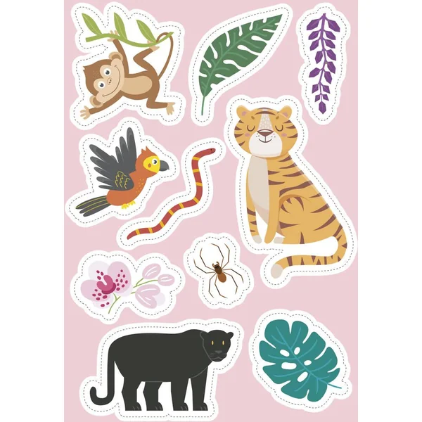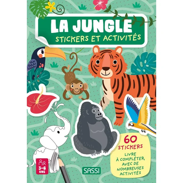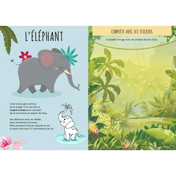 Un livre d’activités pour les jeunes enfants avec des pages à colorier, des labyrinthes à résoudre, des autocollants à coller et de nombreuses informations amusantes sur les créatures qui peuplent la jungle.