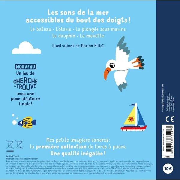 Le livre parfait pour découvrir l’environnement sonore de la mer. Les sons, choisis et mixés avec soin, enrichissent chaque scène pour la rendre encore plus vivante et plonger l’enfant dans un milieu marin, comme s’il y était. Le bateau L’otarie La plongée sous-marine Le dauphin La mouette. Et pour la première fois, un jeu de cherche et trouve sonore avec une puce sonore aléatoire! L’enfant appuie sur la puce et montre ce qu’il entend. Il appuie à nouveau et cherche à quoi cela correspond, et ce, autant de fois qu’il le souhaite !