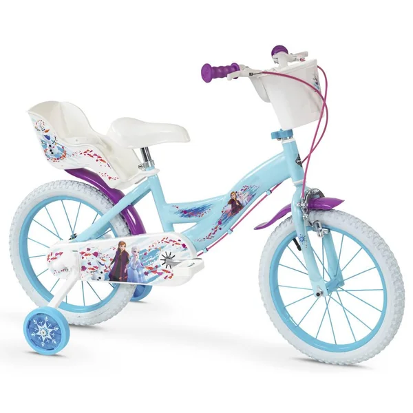 Vélo 16 pouces LA REINE DES NEIGES. Cadre et fourche en acier. Roue libre. Roues à rayons et pneus gonflables. Équipé d’un frein avant de type Caliper et d’un frein arrière de type tambour. Selle souple et ergonomique. Jantes en acier. Avec des garde-boue. Équipé de stabilisateurs à montage sans outil. Avec un kit d’éclairage, piles bouton incluses : 2 piles CR2032 à l’avant et 2 piles LR44 à l’arrière. Réflecteurs (catadioptres) sur roues. Avec sonnette. Avec un porte-poupée à l’arrière et un panier à l’avant. Guidon réglable de 69 à 75 cm. Selle réglable de 54 à 57 cm. Roulements PP haute densité. Pédales avec réflecteurs. Poids maximum de l’utilisateur : 37 kg. Pour les enfants de 1.10 à 1.20 m. 5-7 ans. Norme ISO 8098. Notice incluse. Produit européen, fabriqué en Espagne. Assemblage 85%. Vélo contrôlé et approuvé par les laboratoires AIJU en Espagne.