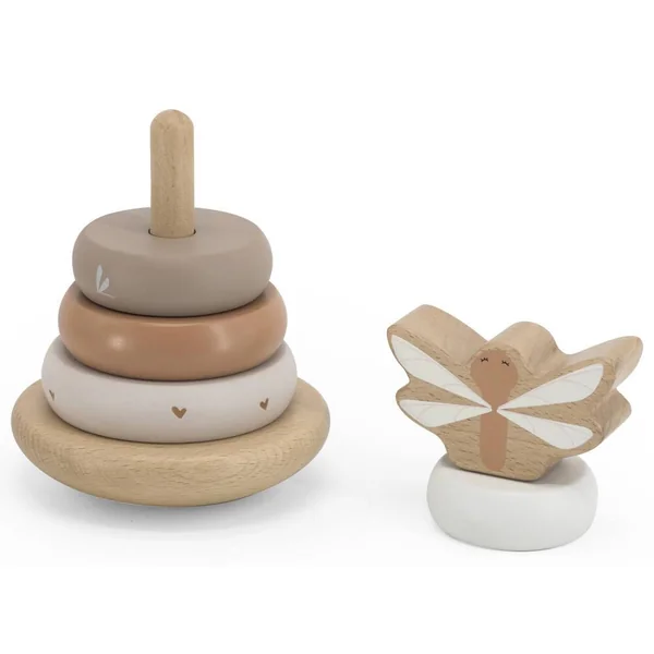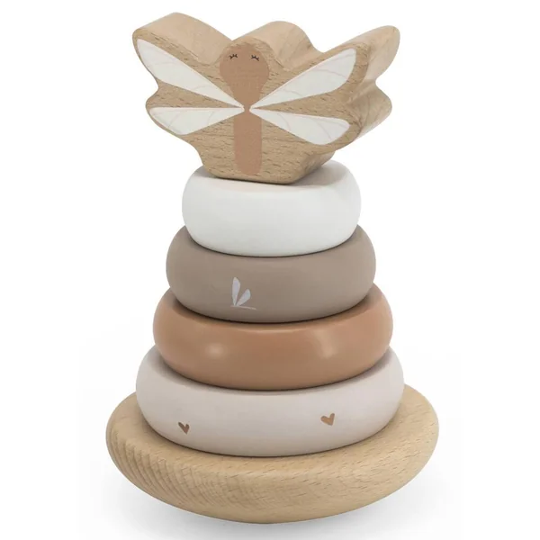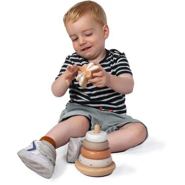 La pyramide à base balançante est faite de bois de hêtre certifié FSC de qualité et a été décorée avec de belles tonalités douces nougat en utilisant de la peinture à base d’eau non nocive pour enfants. Les anneaux d’empilage et le bloc supérieur ont reçu un joli symbole.