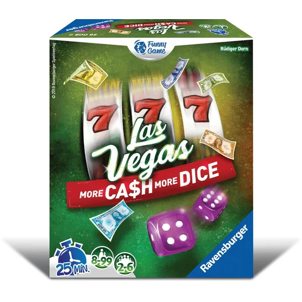 Dans cette extension, découvrez un florilège de nouveaux modules pour enrichir et pimenter vos parties de Las Vegas : de nouveaux billets de 100.000$ qui attiseront pour sûr les convoitises, des gros dés qui valent double lors du décompte des majorités, des cartes bonus qui augmente la valeur de certains billets, de nouvelles actions et surtout un nouveau casino « La machine à sous » ! More ca$h more dice vous permet aussi de jouer jusqu’à 6 grâce à une nouvelle couleur de dés. Composez vous-même votre partie pour encore plus de fun, de rebondissements, de bluff et de traîtrises ! Las Vegas – More ca$h more dice est une extension de Las Vegas et nécessite le base de jeu pour être joué.