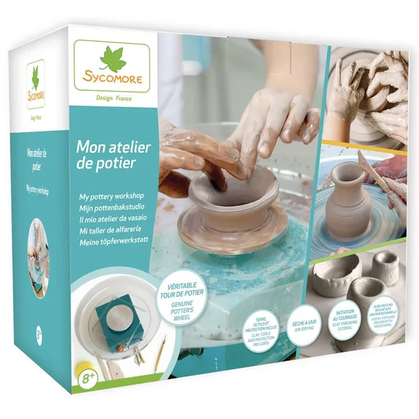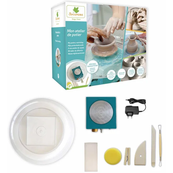 Mon Atelier de potier est un coffret de loisirs créatifs pour les enfants à partir de 8 ans contenant un véritable tour de potier compact et facile à ranger avec 1 plateau en aluminium.