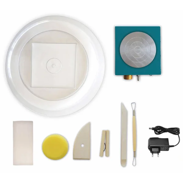 Ce tour de potier est muni d’un interrupteur avant/arrière, d’un bouton pour varier la vitesse (max 1000 tours par minute), un cordon d’alimentation et une prise. Fourni avec 5 outils de poterie en bois idéal pour la sculpture, le modelage, la découpe, le burinage, le lissage, un bloc d’argile, un bac de protection en 2 parties et un livret avec toutes les indications pour s’initier au tournage.