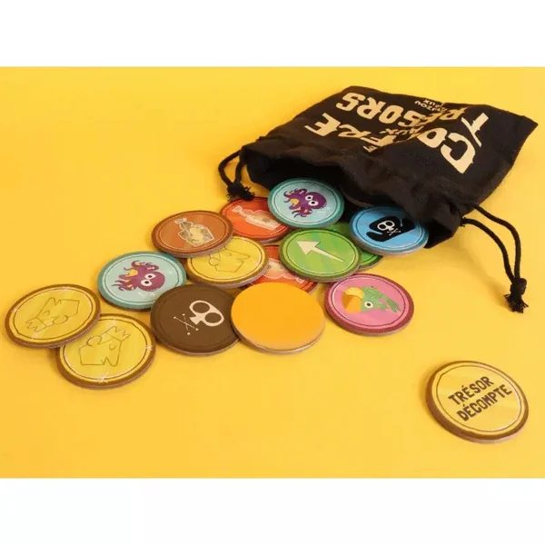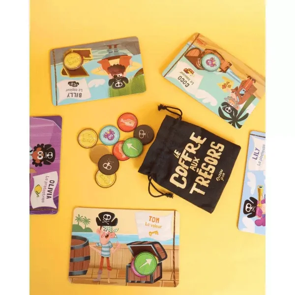 Tu viens de trouver un super coffre rempli de trésors ! Collectionne un maximum de pièces pour gagner la partie, mais attention aux autres pirates qui désirent le même butin que toi ! Un jeu de chance et de tactique !