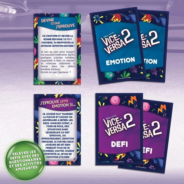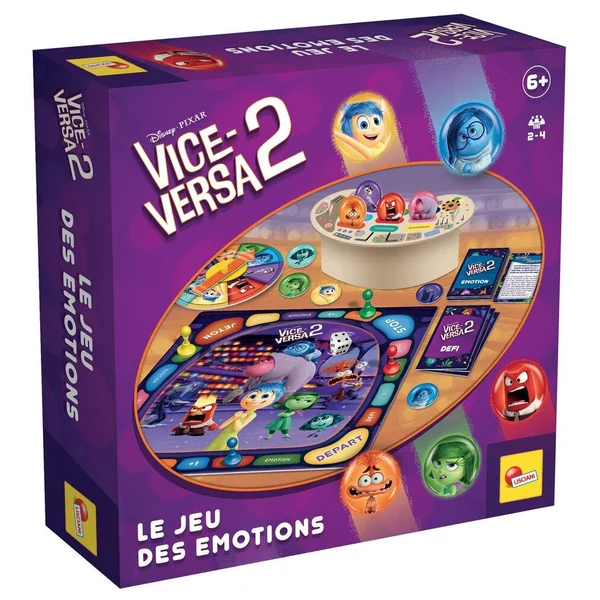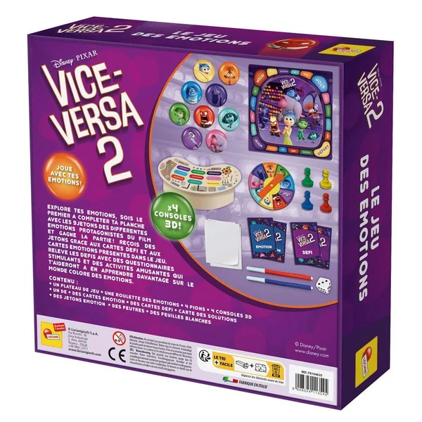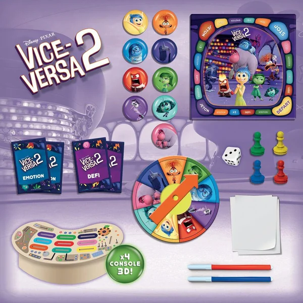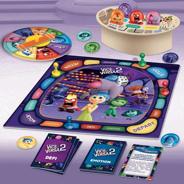 Vice-Versa 2 : Le Jeu des Émotions vous invite à explorer le monde fascinant des émotions de vos personnages préférés ! Le but est simple : soyez le premier joueur à compléter votre console 3D des émotions en collectant les 9 jetons d’émotion : Joie, Tristesse, Colère, Dégoût, Peur, Anxiété, Embarras, Envie et Ennui.