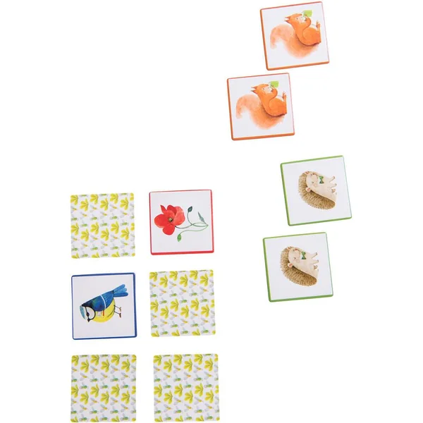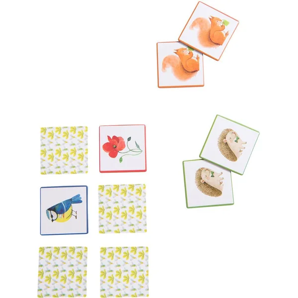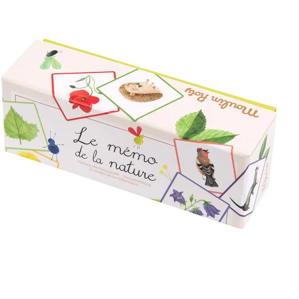 Le mémo de la nature comportant un jeu de 36 paires de cartes illustrées des éléments du jardin : feuille, châtaigne, coccinelle, coquelicot…
